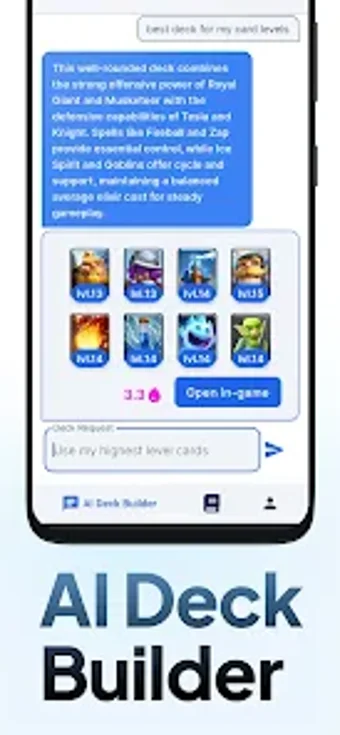 O Meta Royale Decks é um aplicativo gratuito para Android que oferece recomendações de decks personalizadas para o jogo Clash Royale, utilizando inteligência artificial. Com recursos como um construtor de decks inteligente, os usuários podem interagir com a IA para obter sugestões instantâneas de decks com base em suas necessidades, como o tipo de deck desejado ou o nível das cartas. Além disso, a aplicação permite que os jogadores conectem seu ID de jogador do Clash Royale, garantindo recomendações mais relevantes e adequadas ao seu progresso no jogo.